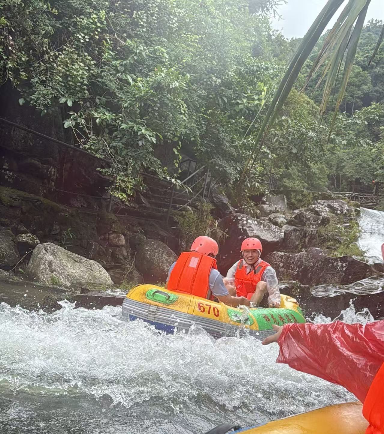 次日早晨,团队前往天露山旅游度假区,这里海拔1251米,森林覆盖率高达92%,是天然氧吧。这条全国首创的“龙中漂流”河道全长3.8公里,总落差达188米。员工根据个人喜好选择不同的活动:寻求刺激的员工参加了峡谷漂流,大家穿上救生装备,乘坐橡皮艇穿梭于蜿蜒的峡谷间,在惊险刺激中培养默契。漂流的速度快得超乎想象,相机还来不及举起,一个又一个浪头便扑面而来,我们选择放下手机,全心全意的感受水花的清凉,感受失重的刺激,感受身边同事毫不掩饰的惊呼与大笑,在山谷中回荡,大家在乘风破浪中释放压力,感受团队协作的乐趣。