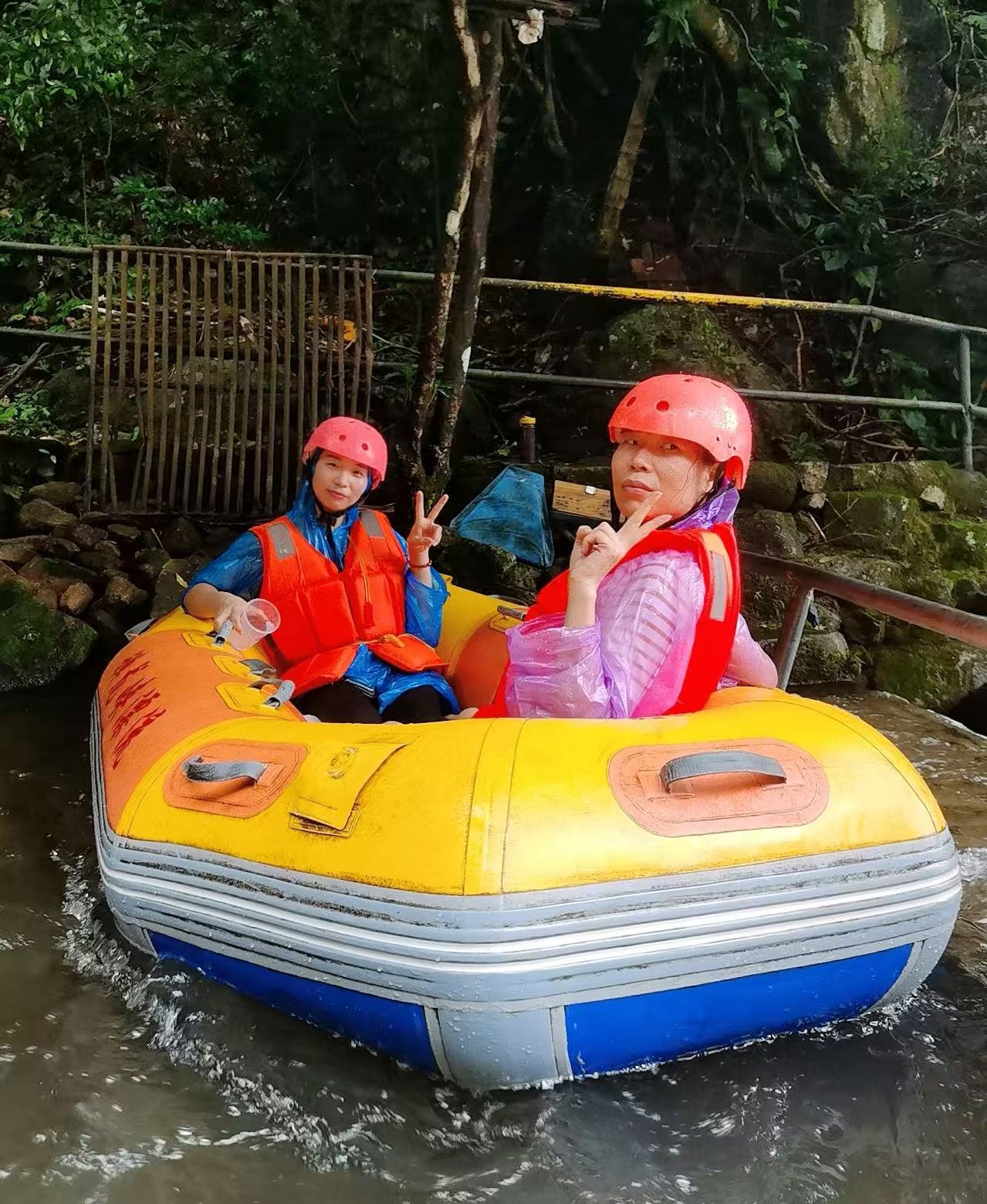 次日早晨,团队前往天露山旅游度假区,这里海拔1251米,森林覆盖率高达92%,是天然氧吧。这条全国首创的“龙中漂流”河道全长3.8公里,总落差达188米。员工根据个人喜好选择不同的活动:寻求刺激的员工参加了峡谷漂流,大家穿上救生装备,乘坐橡皮艇穿梭于蜿蜒的峡谷间,在惊险刺激中培养默契。漂流的速度快得超乎想象,相机还来不及举起,一个又一个浪头便扑面而来,我们选择放下手机,全心全意的感受水花的清凉,感受失重的刺激,感受身边同事毫不掩饰的惊呼与大笑,在山谷中回荡,大家在乘风破浪中释放压力,感受团队协作的乐趣。